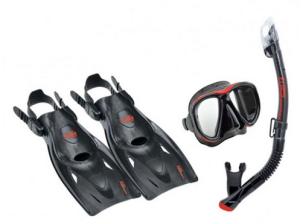 В комплект входит: двухлинзовая маска с увеличенным полем зрения, трубка и ласты.