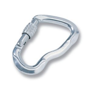 Алюминиевый карабин с двойной системой безопасности. Чтобы открыть карабин нужно при помощи ладони нажать на муфту и пальцами открыть защелку.