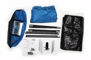 Вход в палатку защищает тканевый полог, а если погода жаркая, то можно оставить закрытой только москитную сетку на входе.