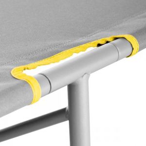Широкие опоры ножек не дают им проваливаться в рыхлый грунт. Стальной каркас делает кресло устойчивым, а неопреновая часть спинки повышает комфорт.