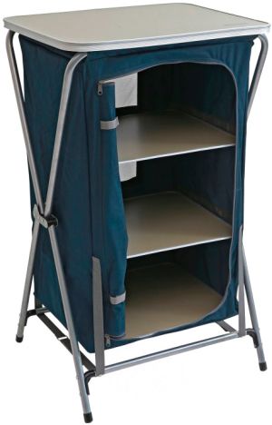 Конструкция устойчивая, имеет 3 достаточно глубокие полки и фибролитовую столешницу. Каркас изготовлен из прочного и легкого алюминия. Продукты внутри надежно закрываются клапаном на молнии.