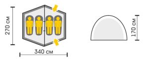 Четырехместная палатка типа "полусфера", выполнена по двухслойной схеме, имеет один вход с удлиненным тамбуром.
