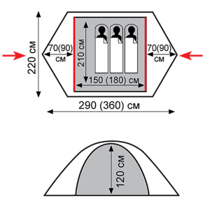 Просторная палатка для трех человек из прочного, непромокаемого материала.