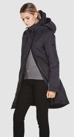 Женская удлиненная куртка с пуховым наполнителем.