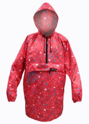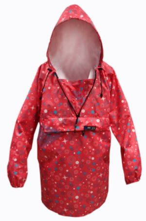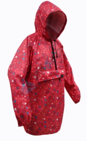 Накидка из влагоустойчивого материала с капюшоном и нагрудным карманом на молнии.
